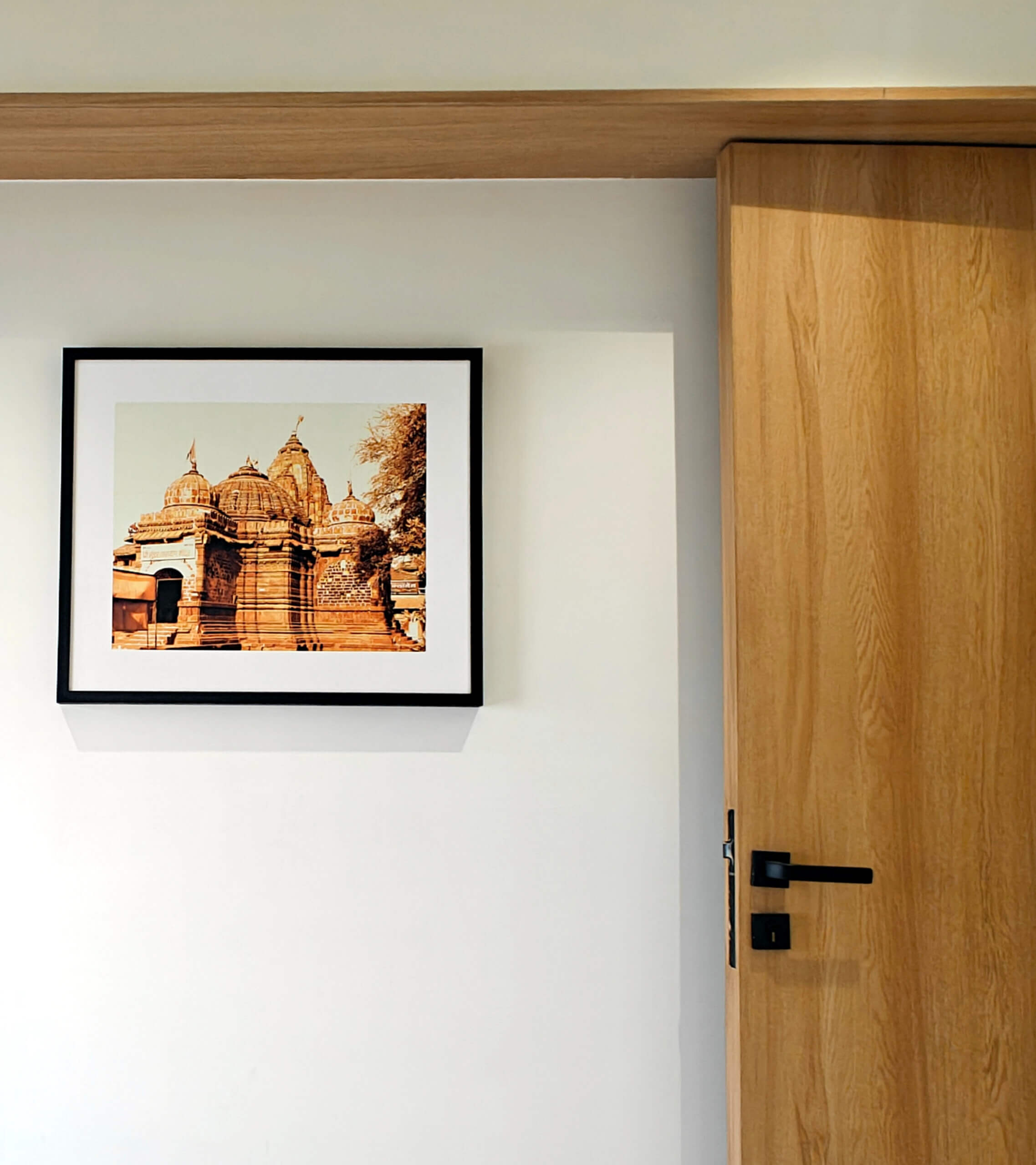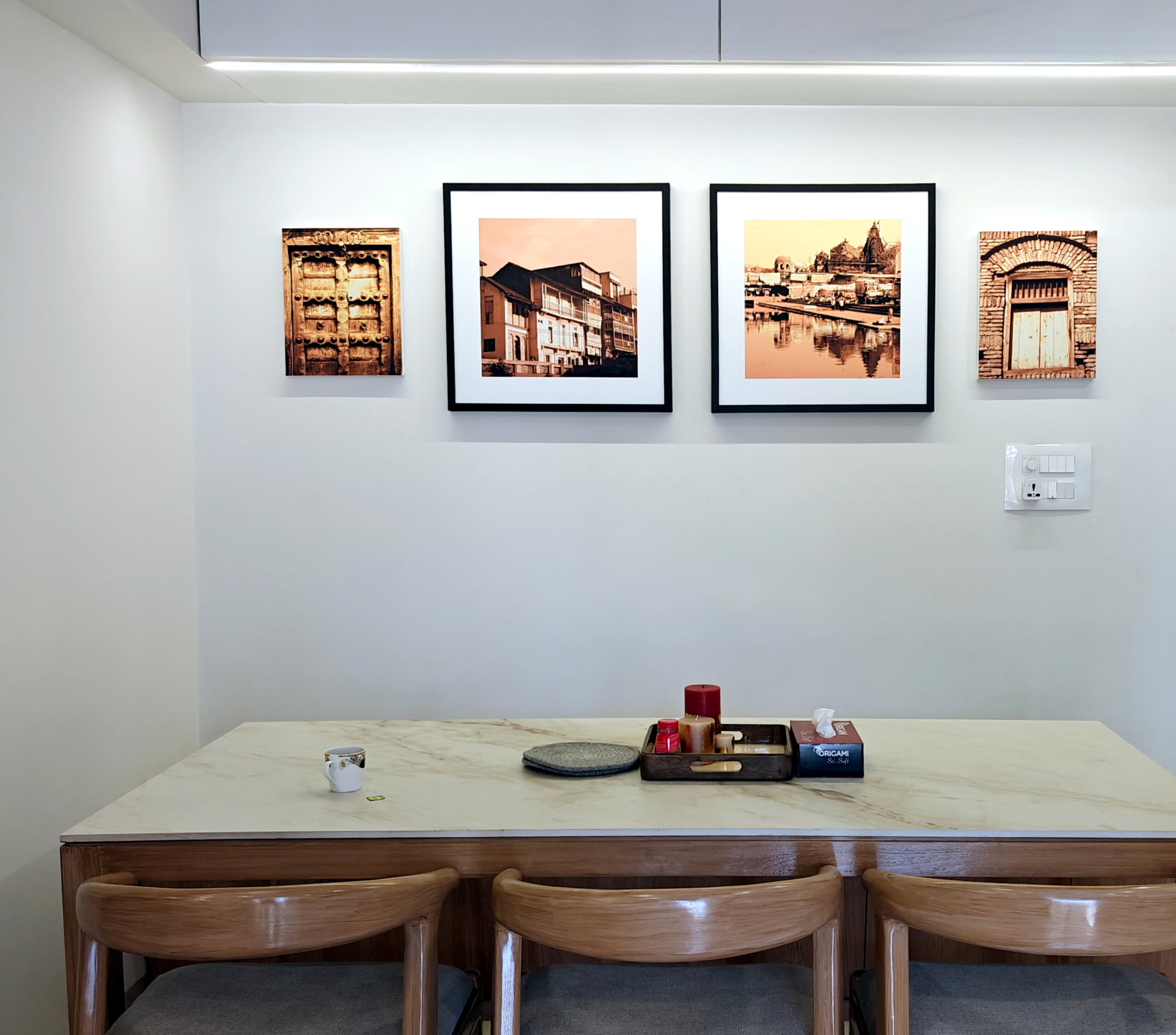 The visual art theme seamlessly blends heritage architecture with elements of nature. Photo paintings crafted on canvas have been introduced across the home, adding depth and enhancing the aesthetic appeal of each space. Reflecting the homeowner’s deep sentimental attachment to the heritage of old Nashik, the living and dining areas, along with the pooja room, feature sepia-toned compositions of historic architecture. These artworks create a warm, nostalgic atmosphere that connects the interiors to the city’s past.