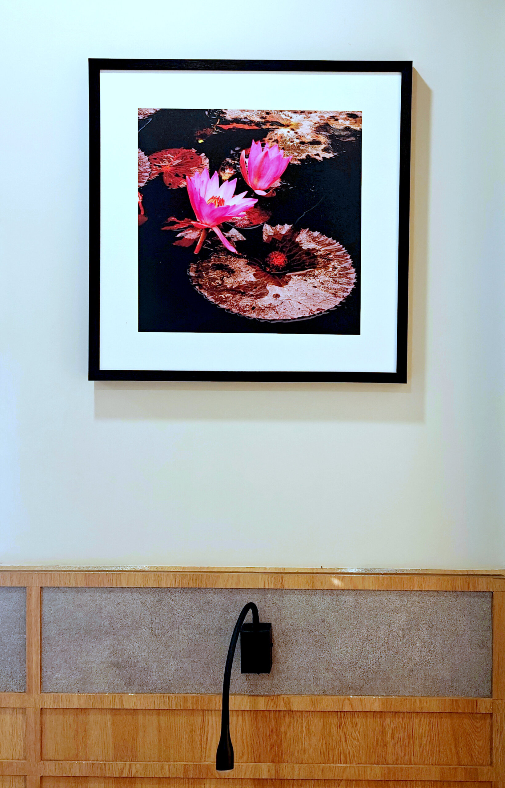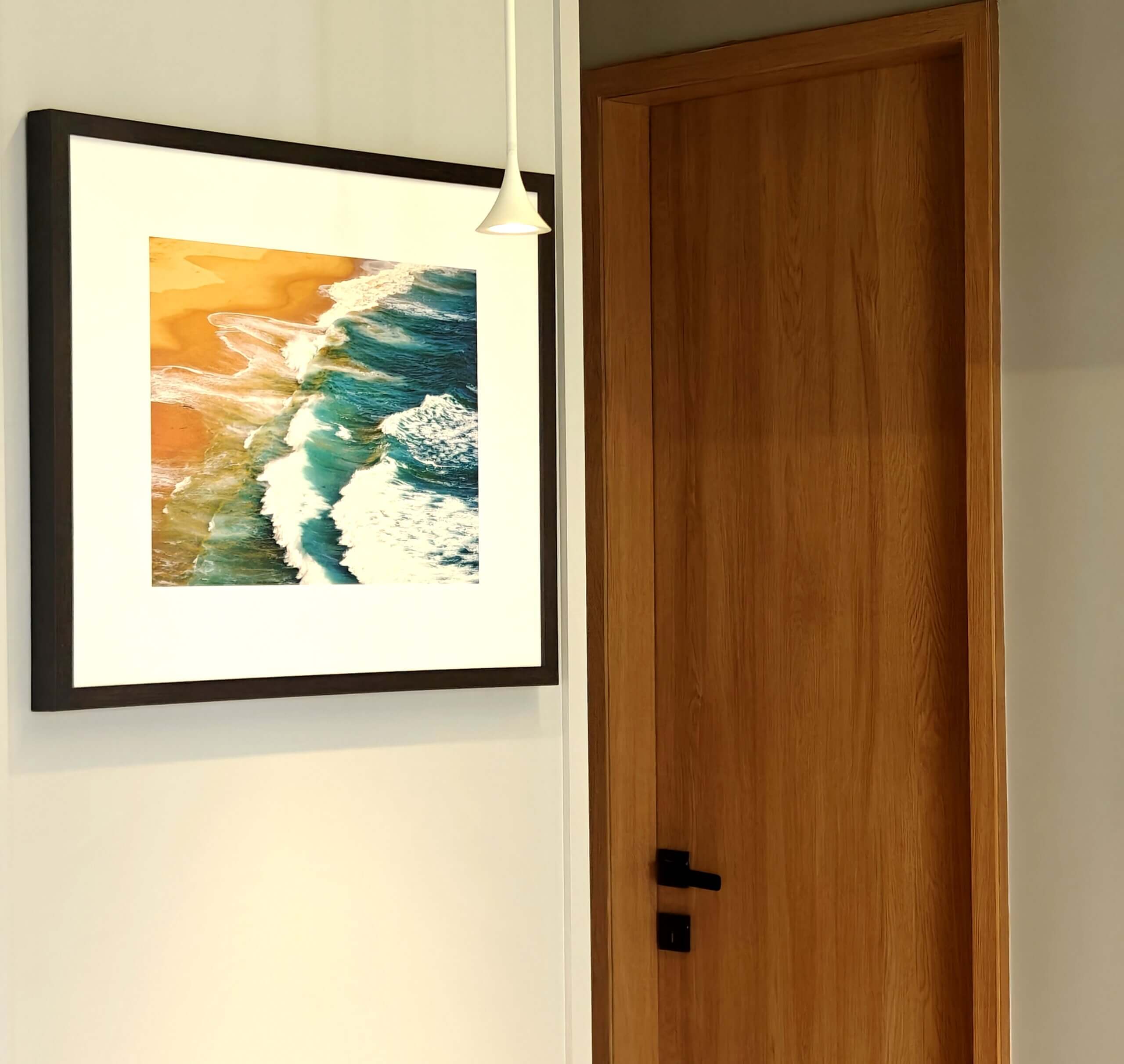 In contrast, the bedrooms are designed with nature-inspired themes to bring freshness and vibrancy. The master bedroom is adorned with soft pink lotus compositions, creating a calm and refreshing ambience, while the other bedroom features blue seascape compositions that add a sense of liveliness and complement the interior colour scheme.