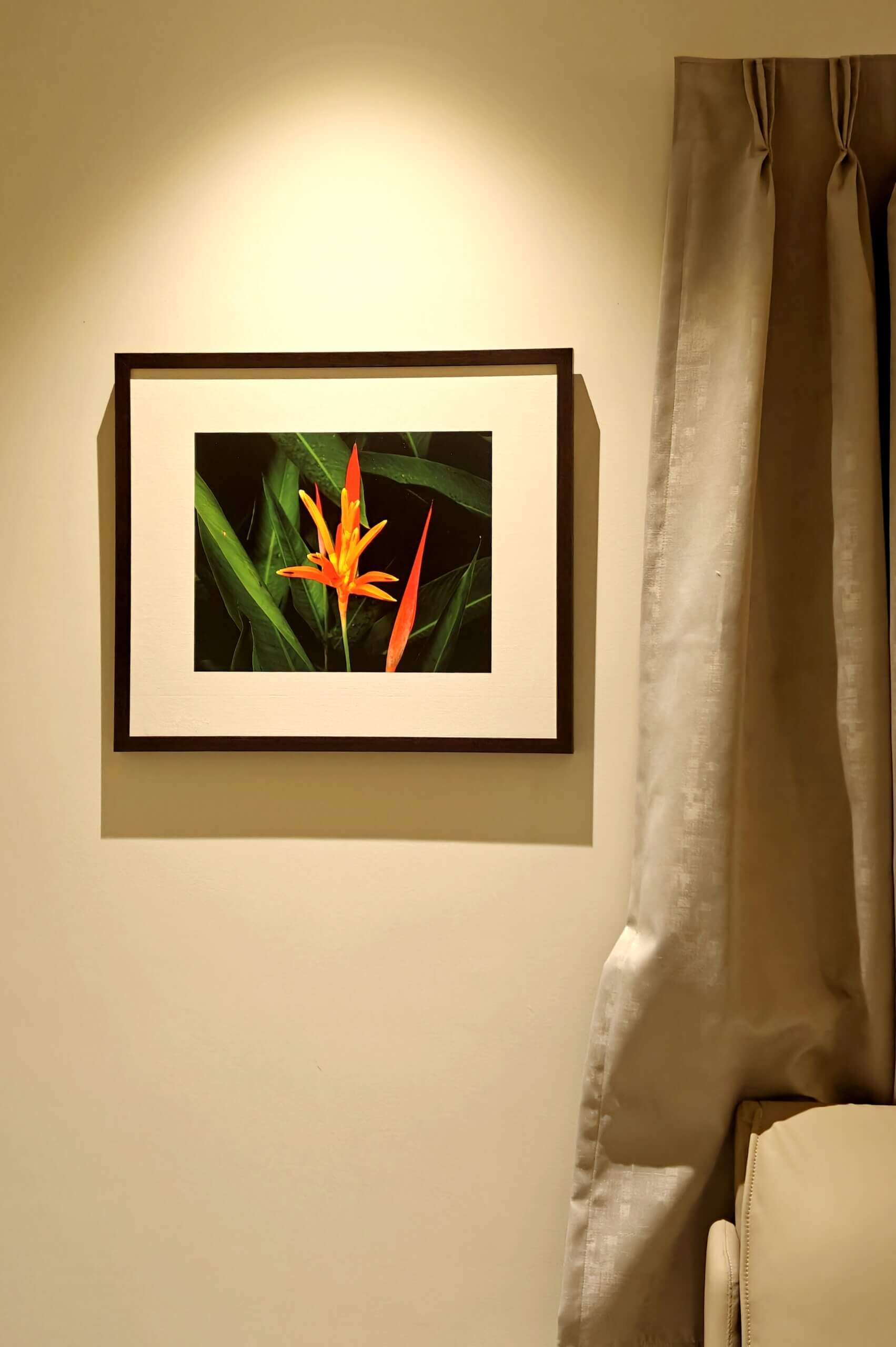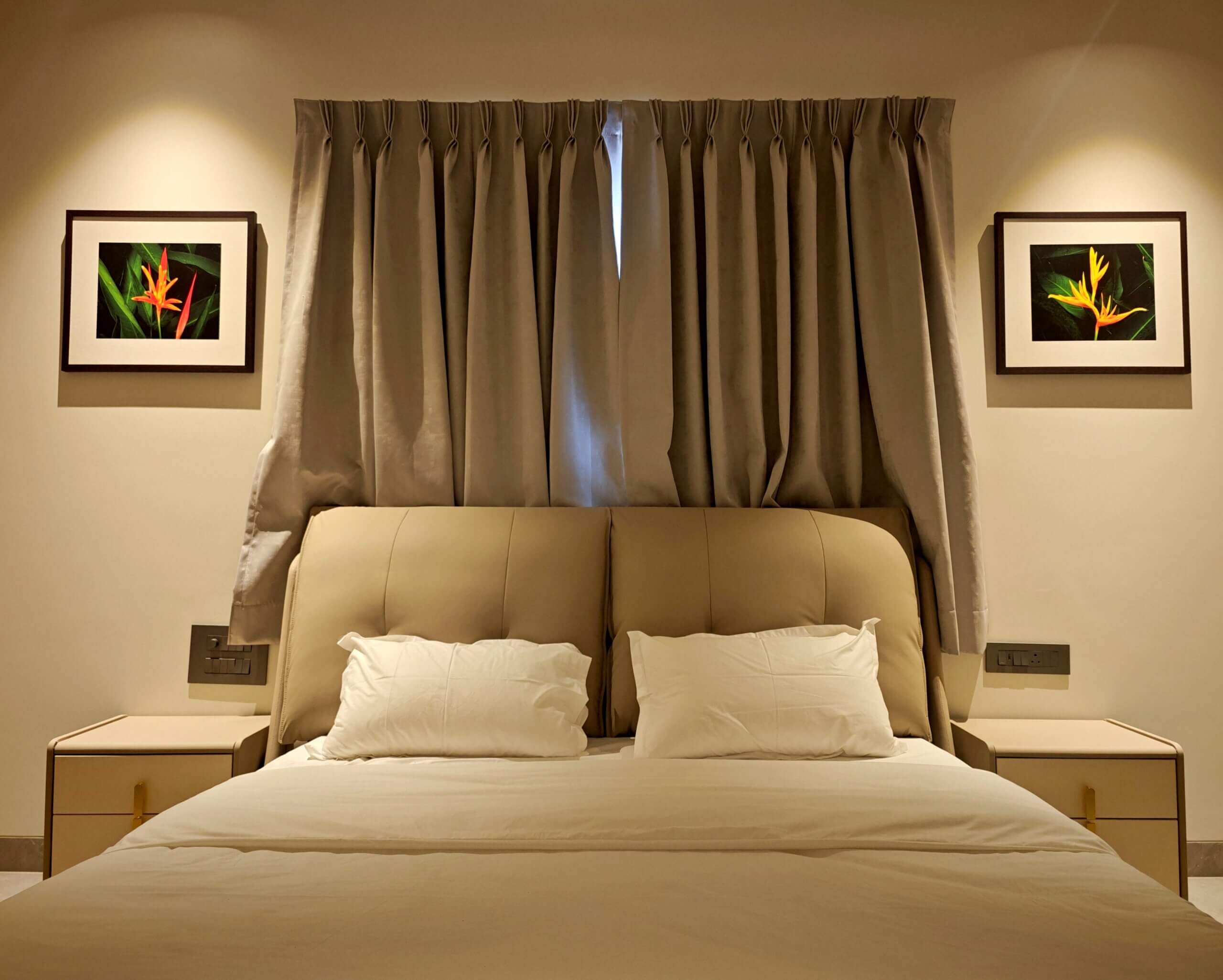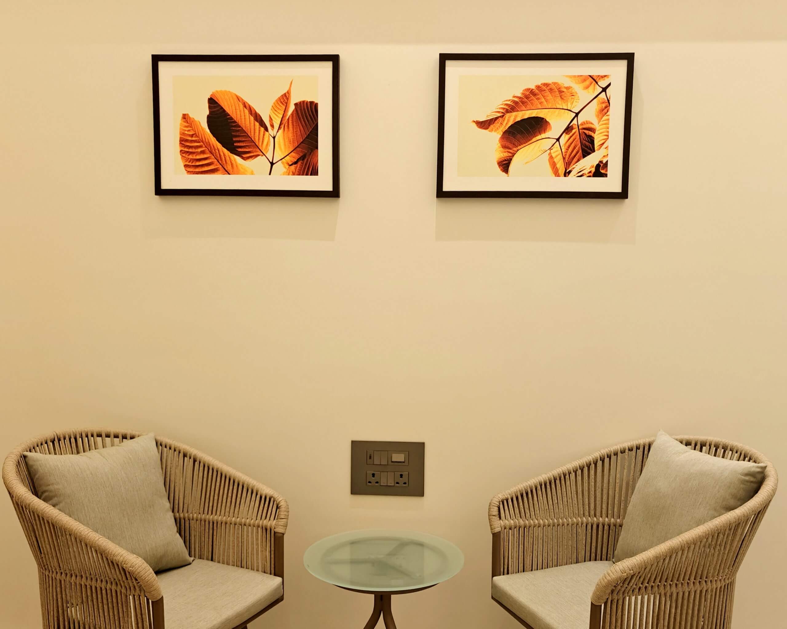 The living room, staircase, and all bedrooms have been enhanced with carefully chosen visual art themes that complement the character of each space. In the living room, canvas compositions of green plants create a refreshing atmosphere while harmonizing with the interior colour scheme and ambience. The staircase is adorned with a frameless canvas composition of palm leaves, giving it the appearance of a large contemporary painting.