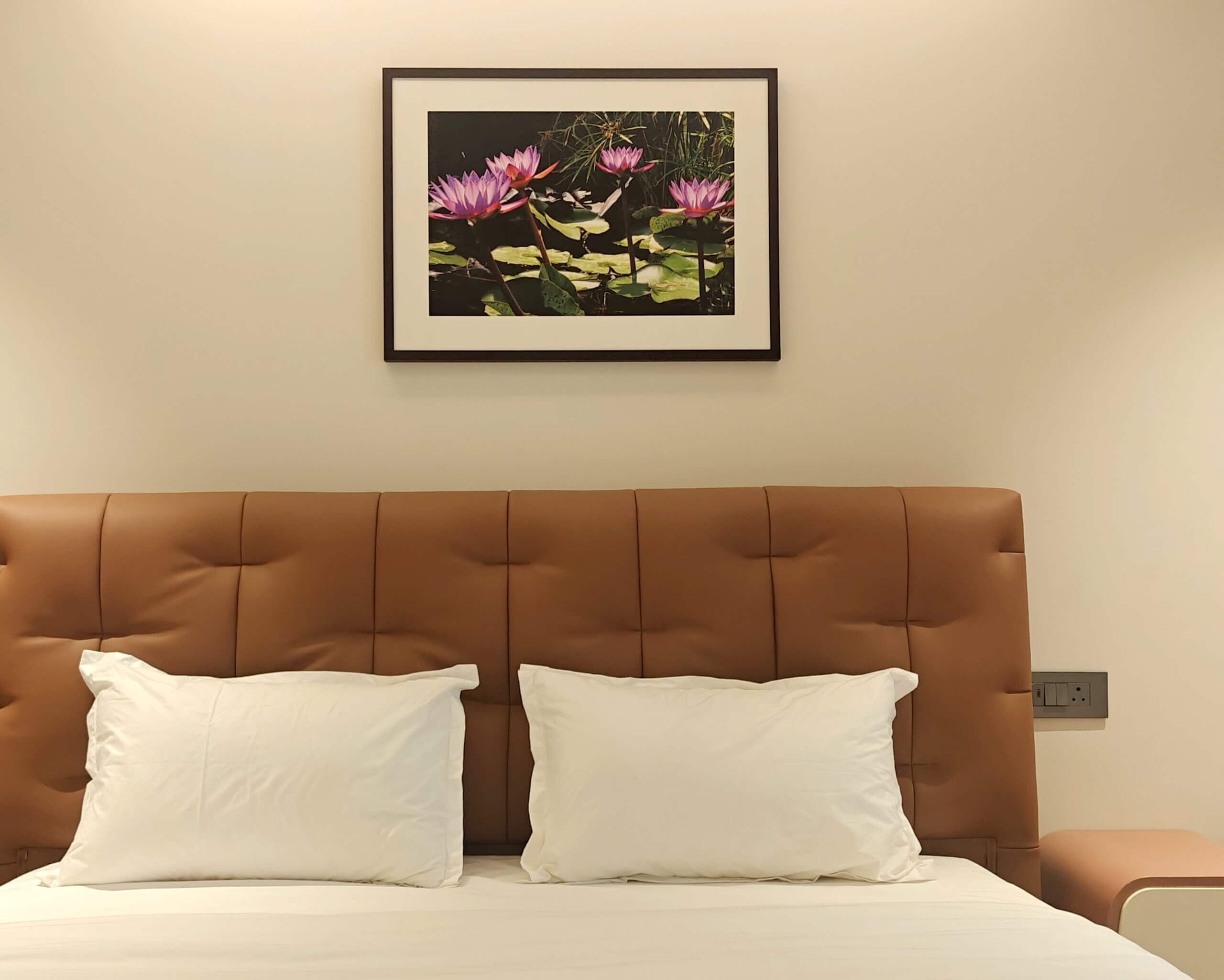 The bedrooms are enriched with visual art treatments featuring colourful floral compositions and sepia-toned imagery. These artworks add depth to the spaces while bringing vibrancy and liveliness to the interiors. Through these thoughtfully placed photo-paintings on canvas, the farmhouse interiors gain both visual richness and a calm, nature-inspired character.